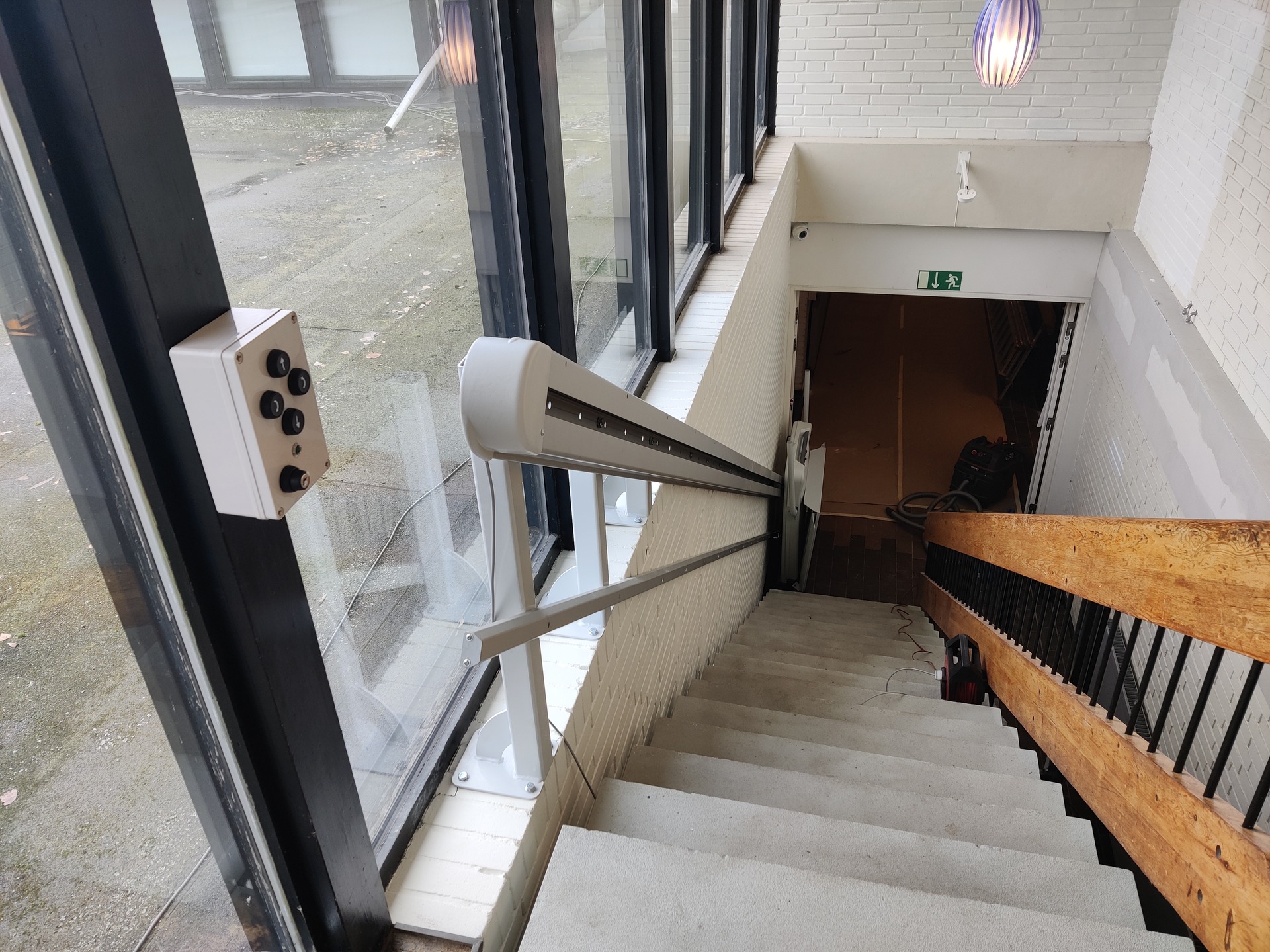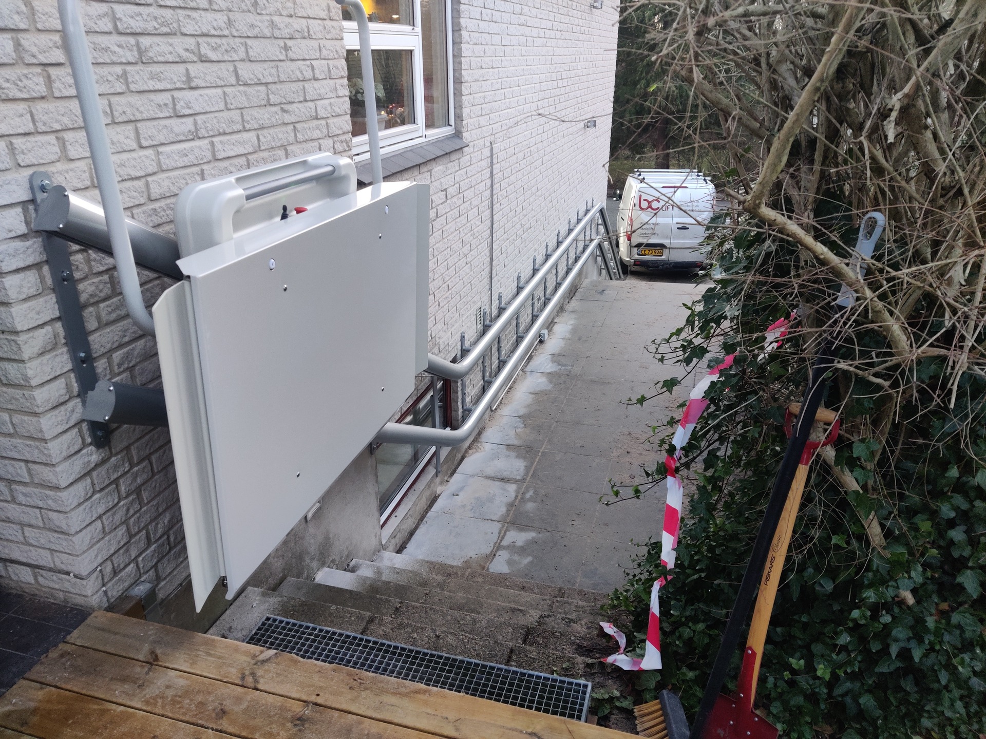 At BC lift we offer a flexible raising/lowering platform lift, which is specially designed for stair areas with limited space at the bottom of the stairs. Thanks to the raising/lowering function, the lift only takes up the absolute minimum space at the bottom of the stairs, making it ideal for places where there is, for example, a door or wall close to the foot of the stairs. The platform lift can be mounted on both the right and left side of the stairs and is suitable for both indoor and outdoor environments.