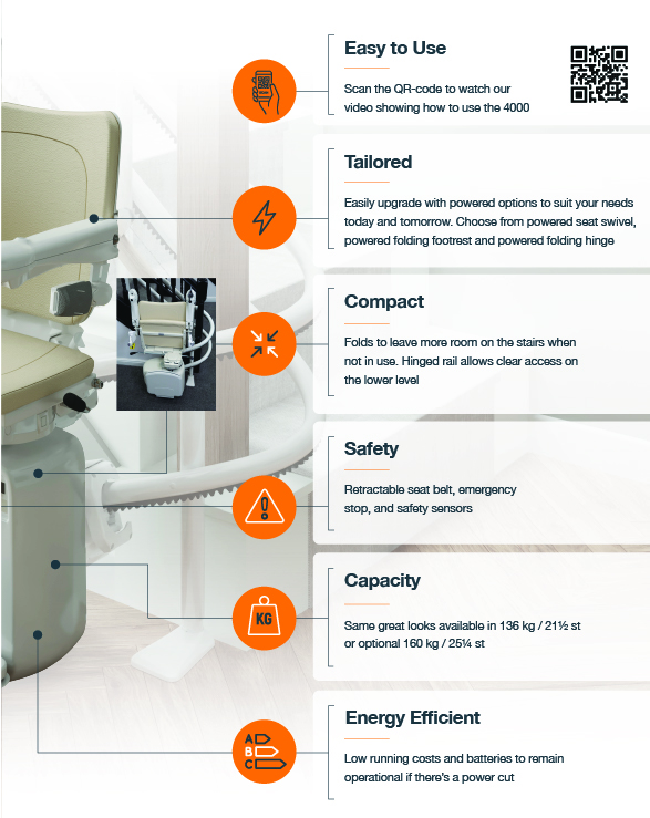 The 4000 can be tailored to suit your décor and style by choosing from our range of colour and seat options in a fabric or faux-leather finish. All our seats are designed for quality and comfort, and fold away neatly to leave plenty of room for other stair users.